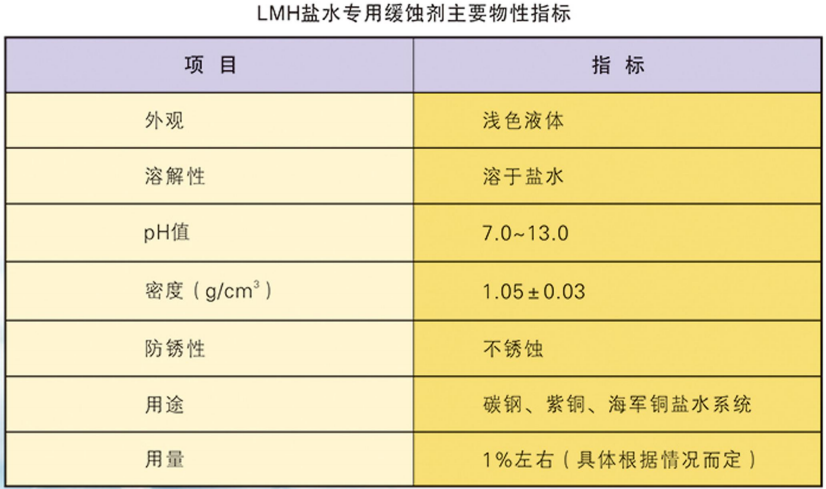 LMH鹽水專用緩蝕劑是用于氯化鈣溶液、氯化鈉溶液及其他氯化物鹽溶液的緩蝕劑,可廣泛用于鹽水制冷系統(tǒng),也可用于其他使用鹽水的環(huán)境,如鹽水鉆井液等,與鹽水溶性良好,適用于碳鋼、紫銅、黃銅等多種材質(zhì)系統(tǒng)。根據(jù)具體情況需定期少量補(bǔ)加,防銹性優(yōu)良,使用方便。