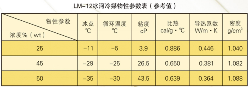 本品適用于保鮮庫(kù)、冷藏庫(kù)、低溫庫(kù)做間接制冷載冷劑使用。使用時(shí)先將系統(tǒng)清洗干凈,然后根據(jù)庫(kù)溫將本品加水稀釋到指定濃度使用,具體使用濃度,及物性參數(shù)參考下表。